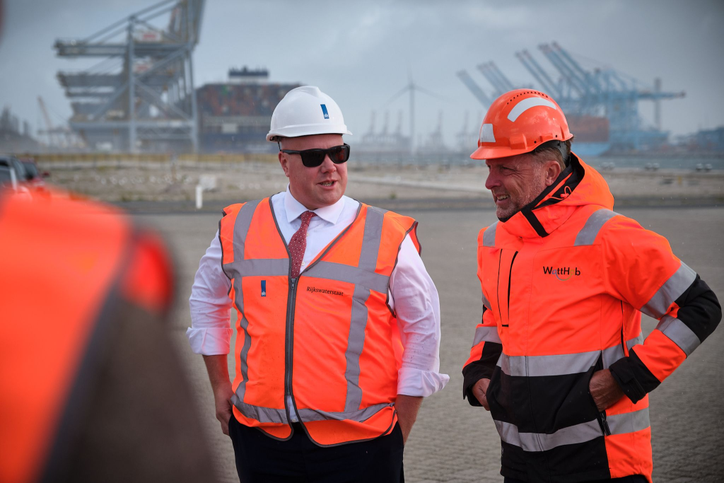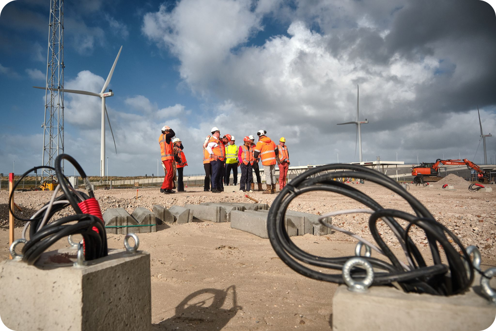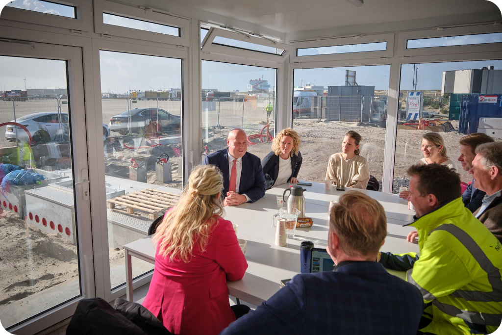 Een stormachtig werkbezoek van Staatsecretaris Thierry Aartsen op de bouwplaats van onze nieuwe vestiging in Rotterdam. Samen met TLN, Bouwend Nederland, Netbeheer Nederland en het Formule E-team in gesprek over de uitdagingen van de energietransitie voor transport en de bouw.